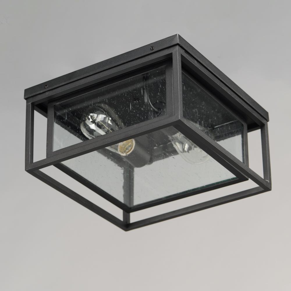 A dual framed structure creates dimension on these outdoor lighting fixtures that is both contemporary and transitional. The construction consists of two frames of square tubing and squared components. The inner frame's Clear Seedy glass reduces gla