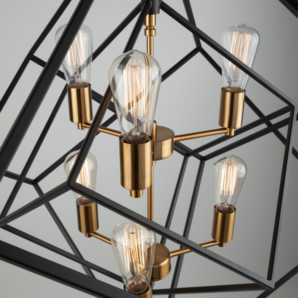Stunning in design, this two tone multiple square chandelier from the "Artistry" collection is an instant classic. The interior has a satin brass frame, while the exterior frame is a matte black finish. Multiple rods included with hangstraight for sloped ceilings. (Larger sizes available)