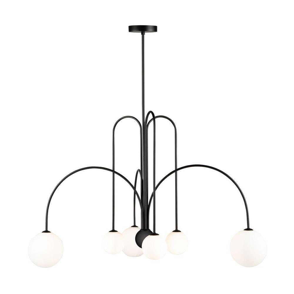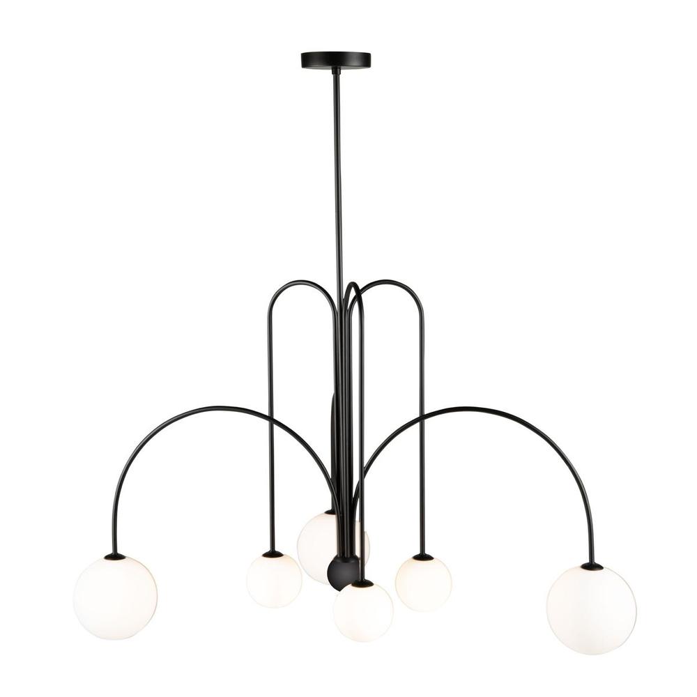 A perfect compliment to any environment is the airy and clean looking "Comet" collection. This series can definitely be a focal point but not distracting. This collection features thin matte black arms and spherical white glassware. This glass is illuminated by bright G9 LED bulbs. 6 light chandelier shown but also has a stunning double type matching pendant.