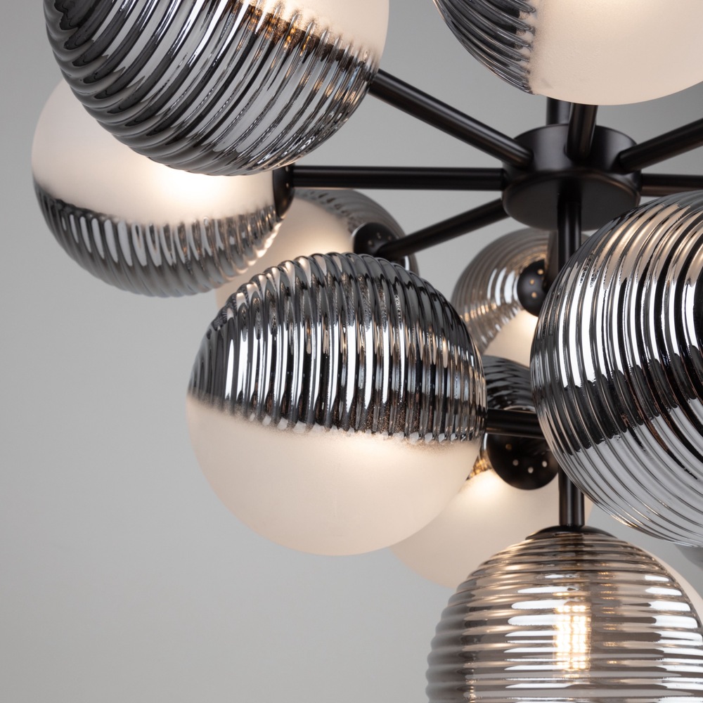 The Bolla Collection radiates unique allure through its innovative design, seamlessly combining half-acid white and half-ribbed smoke glass spheres. The chandelier's interplay of textures and tones establishes a visually striking focal point, effortlessly merging contemporary aesthetics with enduring charm. This unique glassware is complimented with a semi gloss black frame. Single light wall sconce shown. 13 light 3 tier chandelier shown. (height adjustable with rods and built in hangstraight for sloped ceilings)
