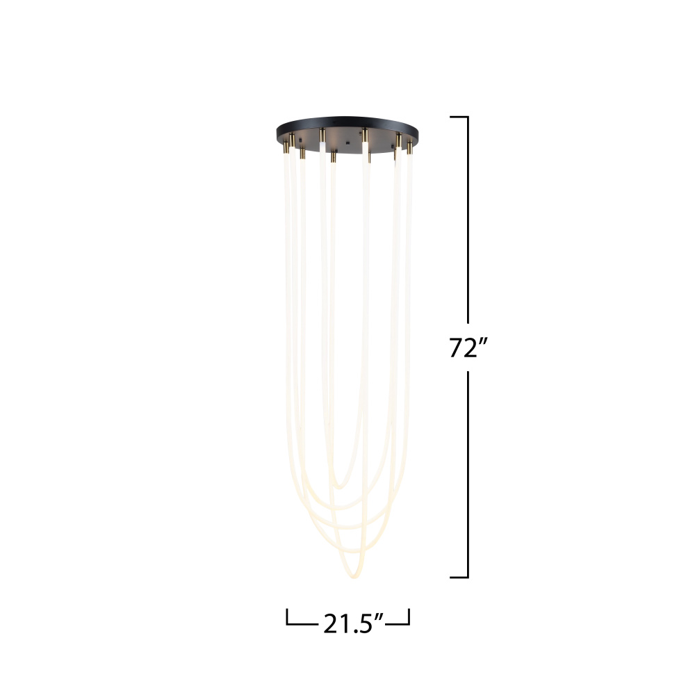 The Cascata Collection, designed by Kevin Kraemer, features a sleek and minimalist design, combining precision craftsmanship with modern aesthetics. The frame is black with brass accents. The bright LED illuminated silicone drapes throughout giving this collection an illusion of weightlessness. This eye-catching collection is a perfect complement to any surrounding. The model shown is a foyer type chandelier. Great for a heigh ceiling or staircase. (There is an optional adapter to lengthen this chandelier)