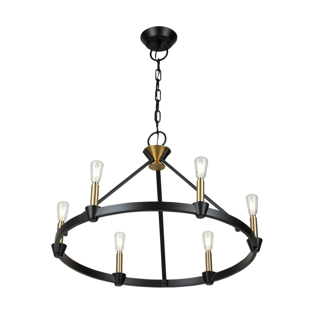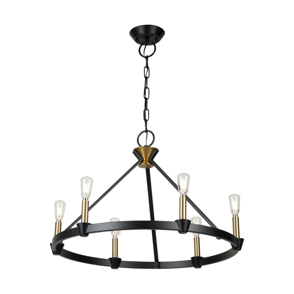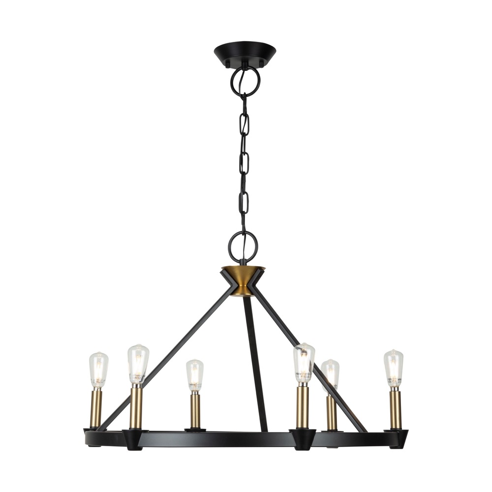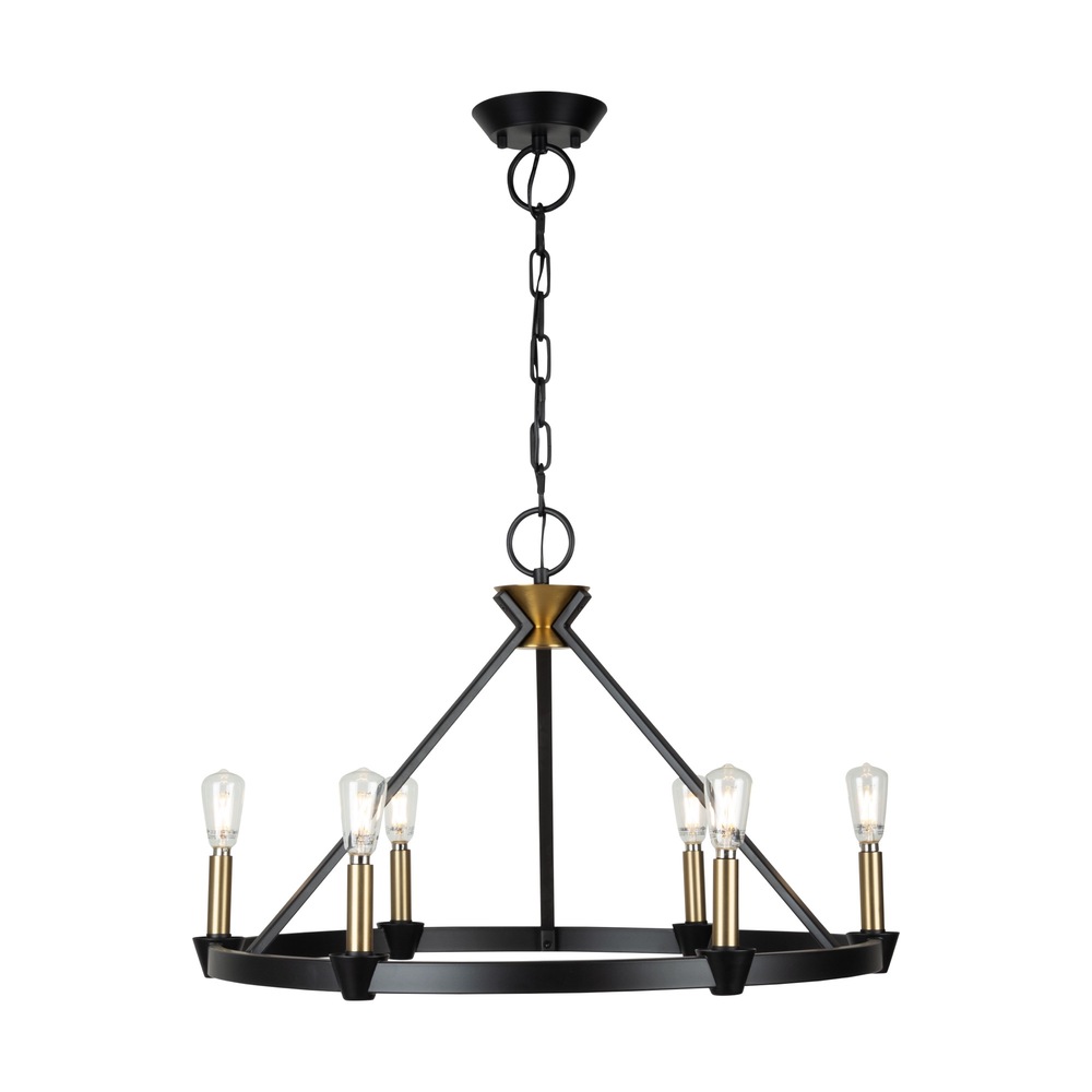 Created by designer Kevin Kraemer, the Notting Hill collection showcases a sophisticated design with black metal frames, exquisitely complemented by brass candle covers and accents. The combination of these finishes adds a touch of elegance and modernity to the collection, creating a visually striking and stylish visual. The use of specific elements highlights Kraemer's attention to detail and commitment to creating unique, contemporary pieces. The 6 light ring type chandelier is shown. (Height adjustable via chain)