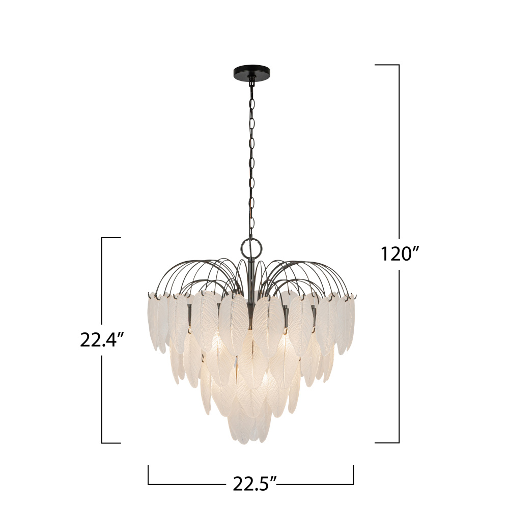 The Alessia Collection chandelier is a captivating blend of modern elegance and nature-inspired artistry. Its bold black frame cradles cascading glass leaves, each etched with organic, lifelike details that evoke a serene forest canopy. With its enchanting glow, this chandelier helps transforms any space. (22.5" inch diameter)