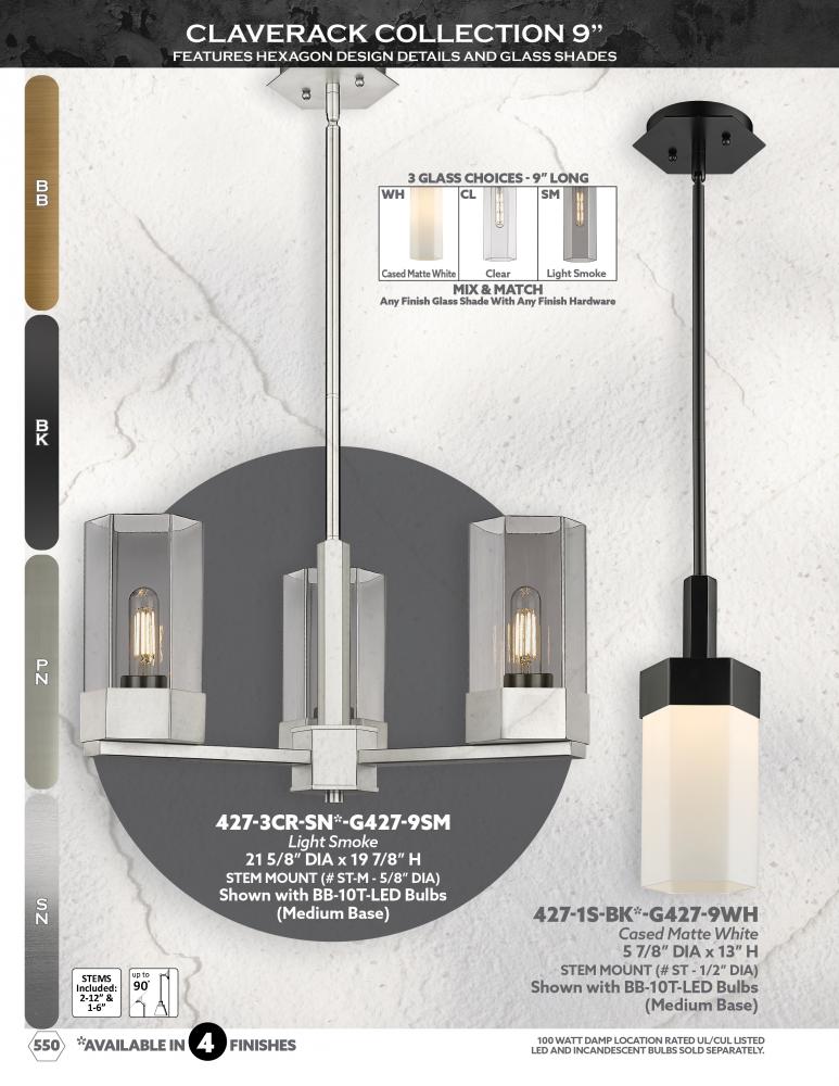 Geometric design is the star of the Claverack Collection. The hexagonal details of the metal frame is accentuated by the similarly shaped glass shades. Claverack offers a full line of fixtures to suit any project or space.