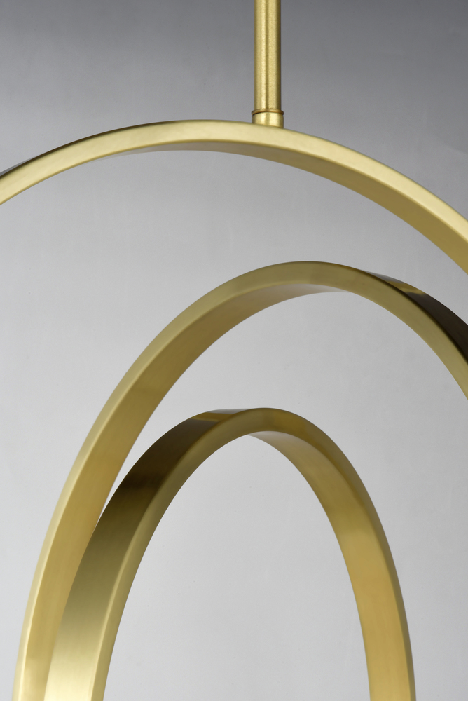 Adjustable rings available in Polished Chrome or Satin Brass add dimension to this contemporary pendant design. Opal white glass softly diffuses light to complete the look.