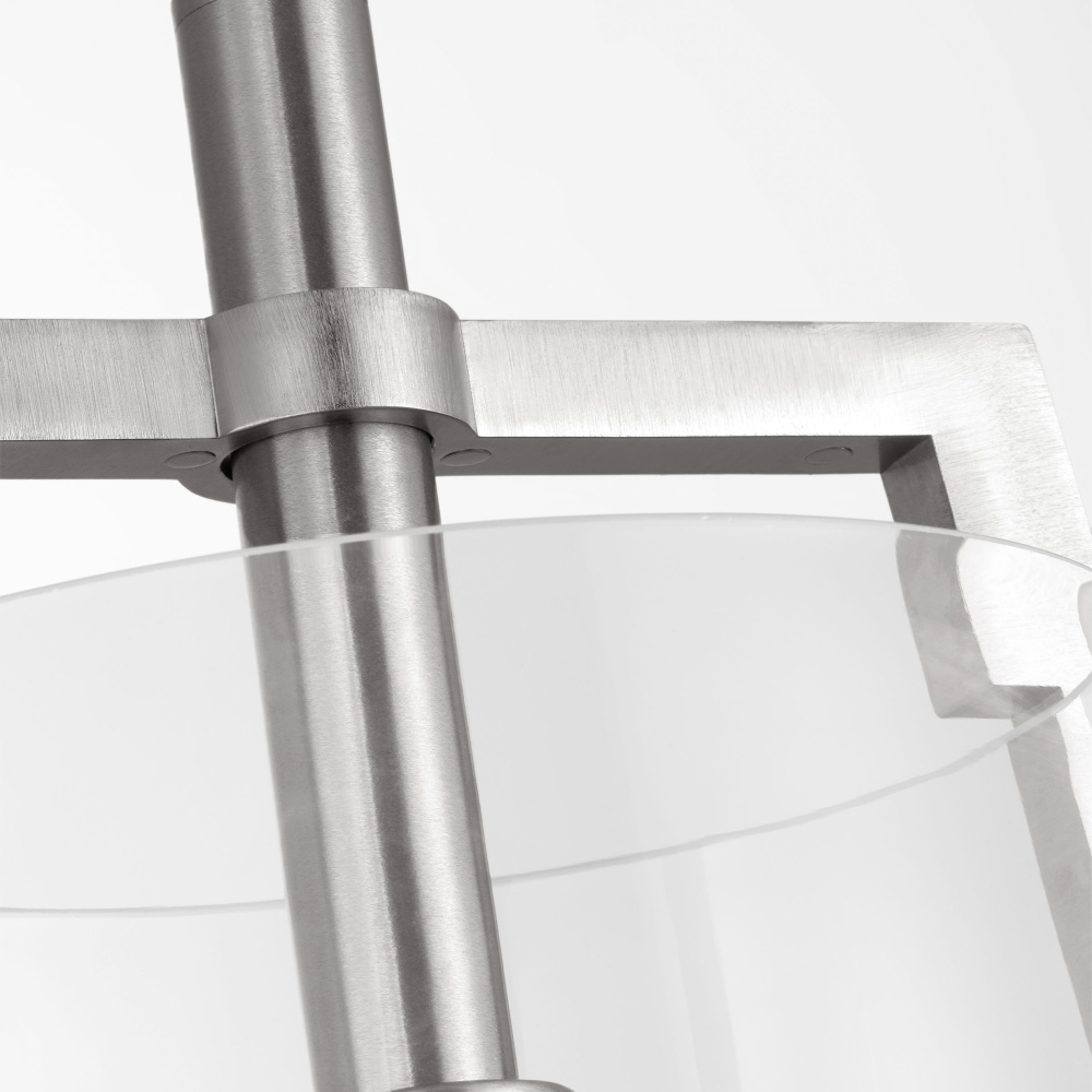 Crafted with Steel in a Brushed Nickel finish with clear glass shade