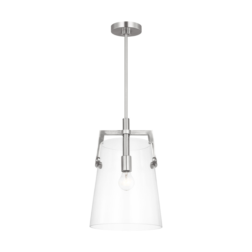 Add a bright burst of light where you need it most with the stylish Drew & Jonathan Crofton one light pendant, featuring a sleek colonial crackle clear glass shade. Made to coordinate across a broader range of bath hardware and design styles, the Crofton is available in four popular finishes, Brushed Steel, Chrome, Midnight Black, and Satin Brass. This light looks great on its own or installed above a bathroom vanity, and the glass shade makes it ideal for filament bulbs. This fixture may be mounted in the up or down position, and is cETL listed for damp locations, making it the perfect lighting solution for any space.