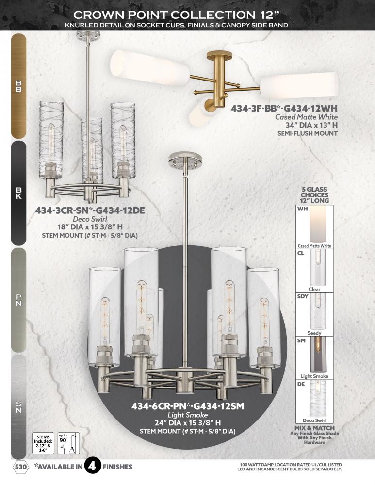 Details abound in the Crown Point Collection with an industrial take on modern sophistication. This stunning line of fixtures features cylindrical glass set in an updated restoration style frame with intricate knurling detail on the sockets, canopy, and fi