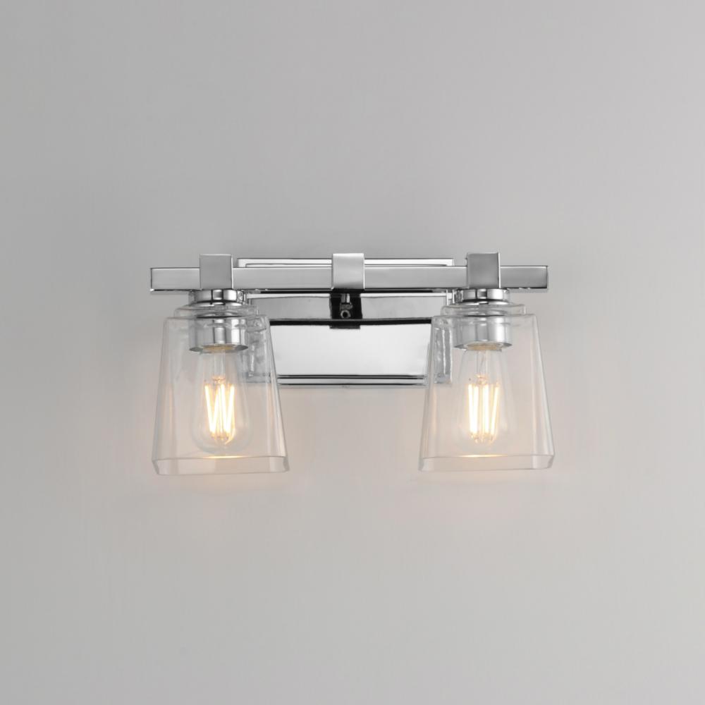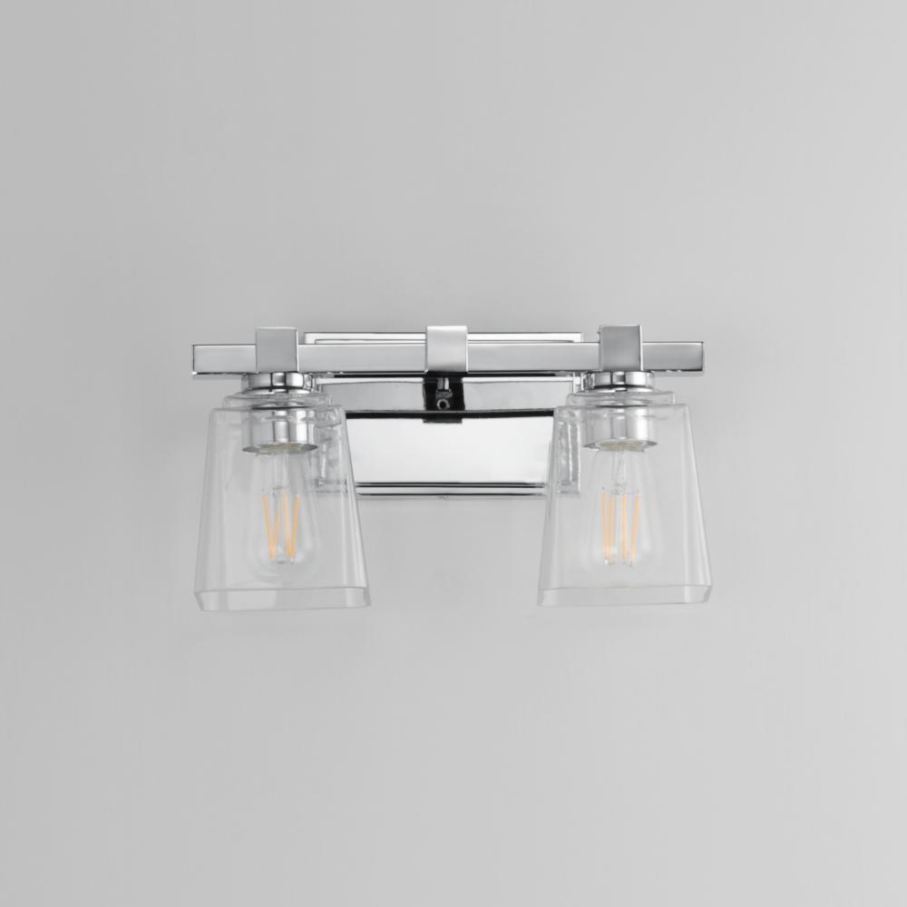 A composition of square forms that feature a Clear tapered square glass shade, these bath vanities provide a transitional design that suits both modern and traditional spaces. Available in Matte Black, Polished Chrome, Satin Nickel, and Natural Aged Brass.