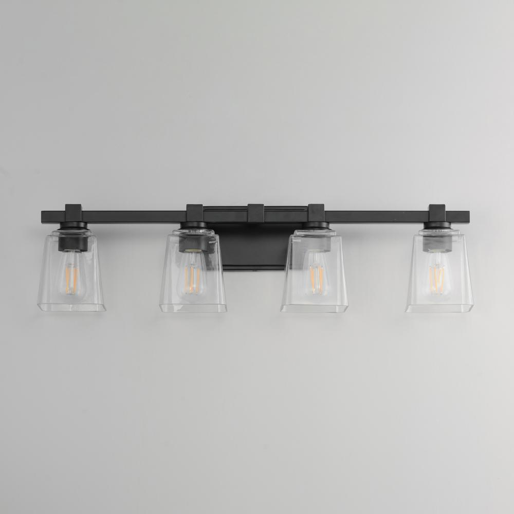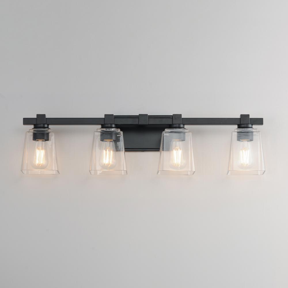 A composition of square forms that feature a Clear tapered square glass shade, these bath vanities provide a transitional design that suits both modern and traditional spaces. Available in Matte Black, Polished Chrome, Satin Nickel, and Natural Aged Brass.