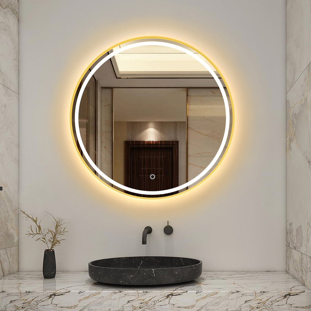 The Reflections collection LED mirror features a sleek design with a circular brushed brass frame, seamlessly combining modern functionality with a touch of elegant aesthetics. This mirror has a “Smart Touch Switch” which allows dimming, on/off, and the ability to change the color temperature from 3000, to 4000 to 5000 kelvin.