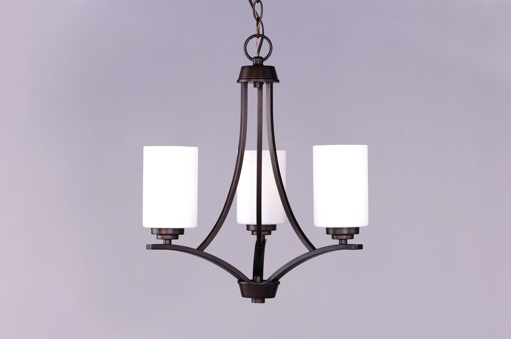 Low sloping arms of rectilinear tubing is finished in a variety of options that include Satin Nickel, Oil Rubbed Bronze, Matte Black, and a contemporary Satin Brass finish. Tall, cylindrical Satin White glass shades soften the light source within. Offered