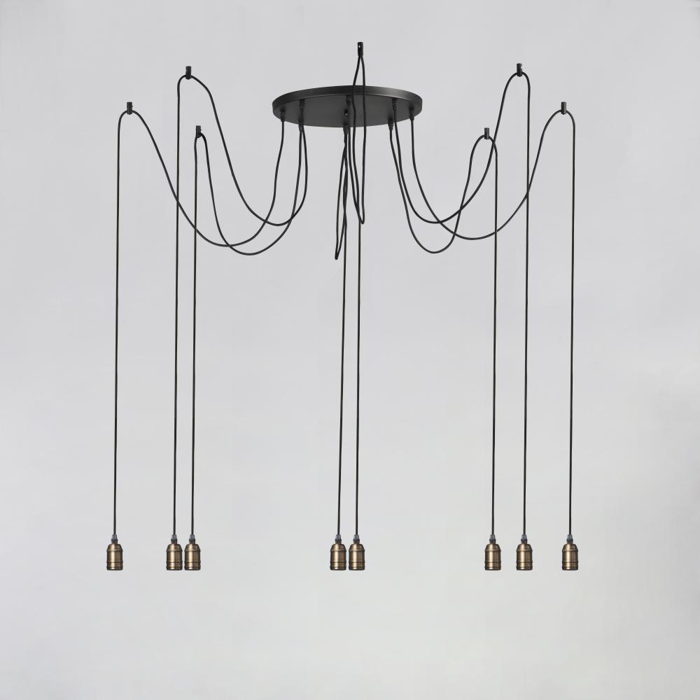 Cords of Black fabric support metal sockets finished in a natural Antique Brass allow you to create unique and fun lighting. All except the single pendant are supplied with hangers that attach to the ceiling to allow you to swag each socket. There are a nu