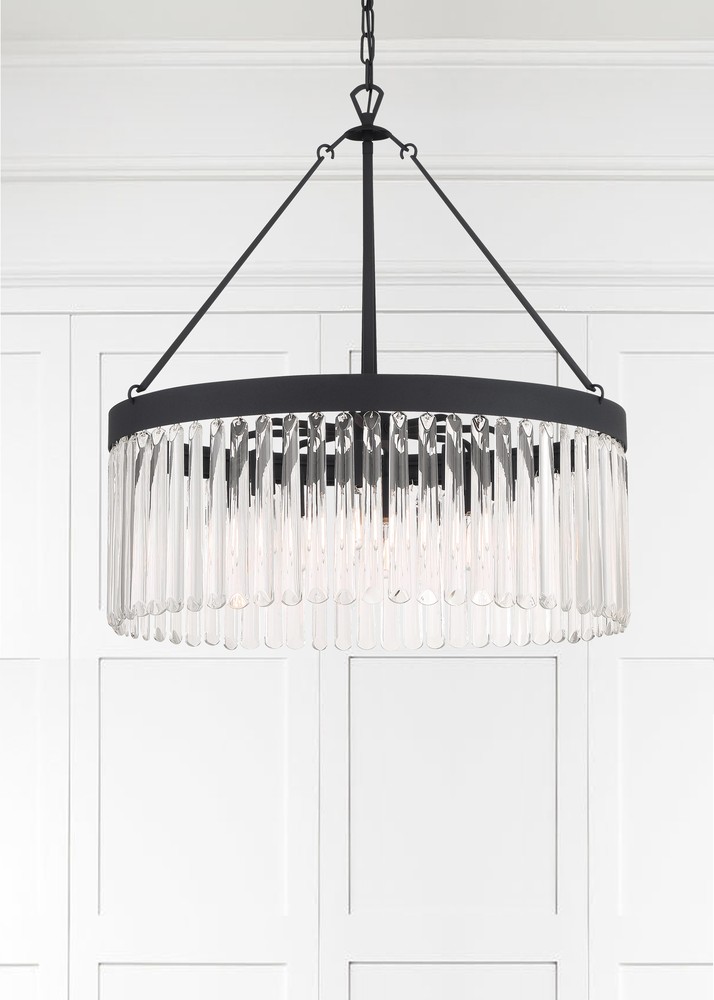 Art deco design is exemplified in the Emory collection. The collection features a row of smooth glass prisms hanging from a steel frame. Both the Black Forged and Modern Gold finishes, add all the sparkle and glamour you need in a fixture.