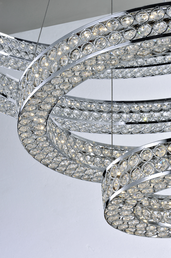 Frames of metal rings encased with Beveled Crystal Jewels, are finished in Polished Chrome. Suspended by cables as if floating In air, these rings cast rainbows of light when illuminated by the Integrated LED.