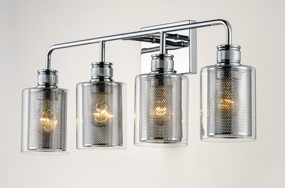 Clear glass cylinders lined with mesh screen are supported by knurled cups of Polished Chrome creates a contemporary design with an industrial twist. This economical collection provides a designer