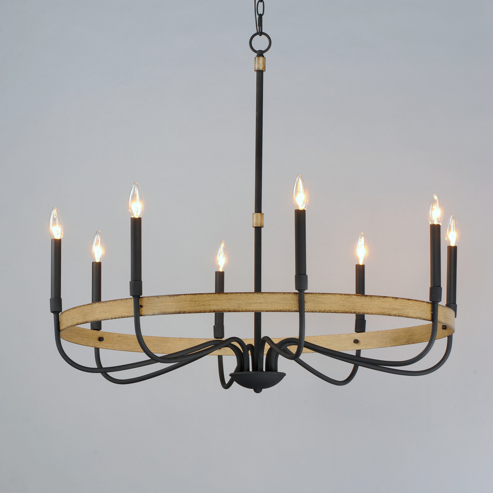 Rustic charm in an elegant, yet simple chandelier with warm distressed wood finishes and textured black metal arms. Black candle covers evoke wax candles to complete the classic and transitional appeal of this series. The flush mount features a satin white