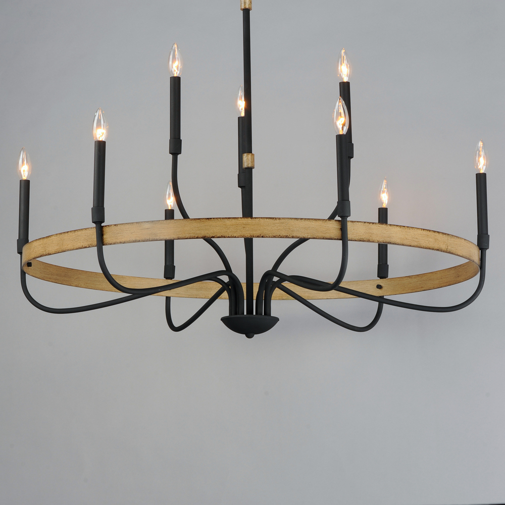 Rustic charm in an elegant, yet simple chandelier with warm distressed wood finishes and textured black metal arms. Black candle covers evoke wax candles to complete the classic and transitional appeal of this series. The flush mount features a satin white