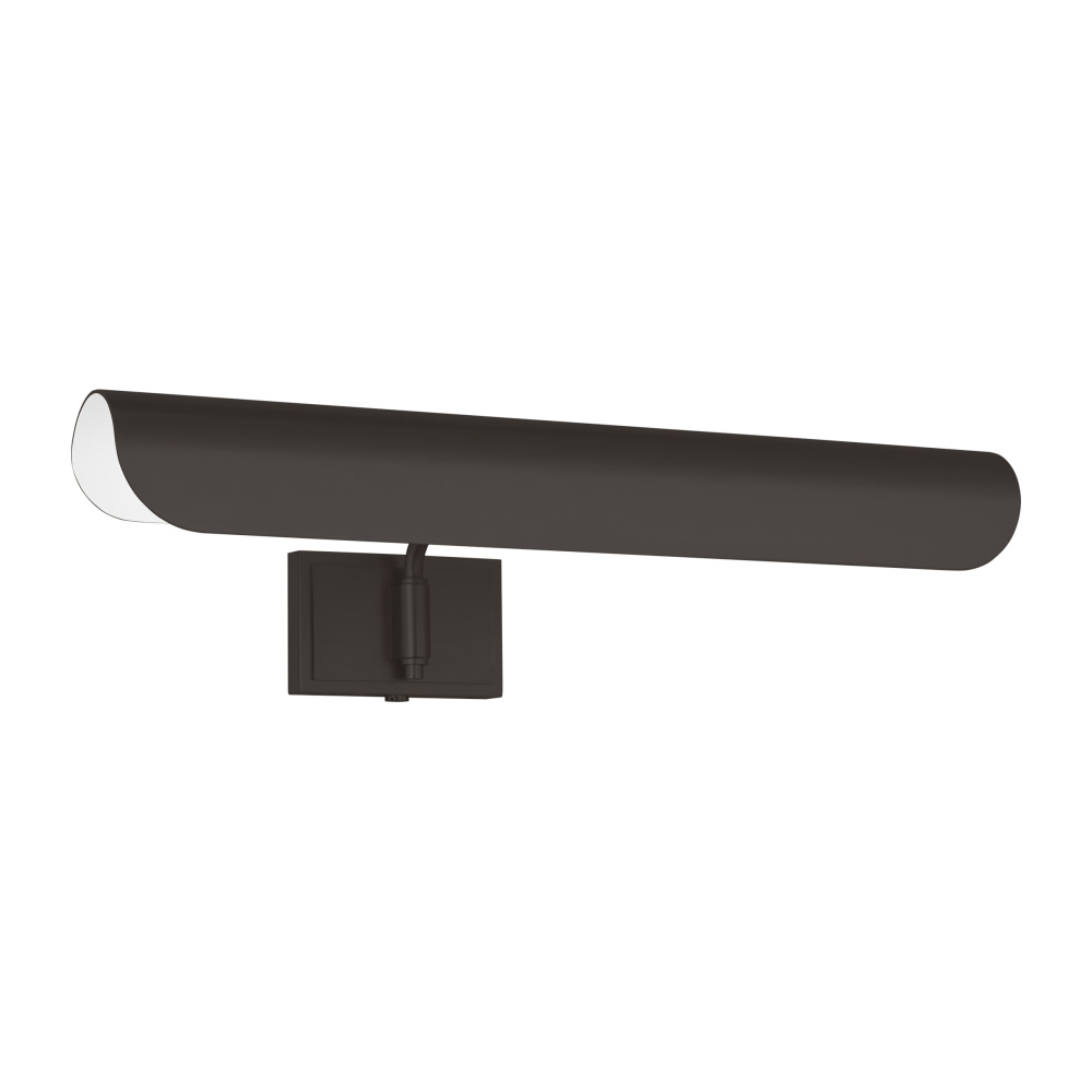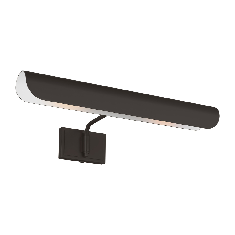 Inspired by a ship's outer hull, the Hull series by Chapman & Myers has a unique shade of these picture lights made from a single piece of metal bent into a cylindrical form. These picture lights have an open-ended design directing light both down and to the sides. A subtle horse saddle design and double barrel back-plate detail that pivots in the direction needed. Available in three sizes and two finish options.