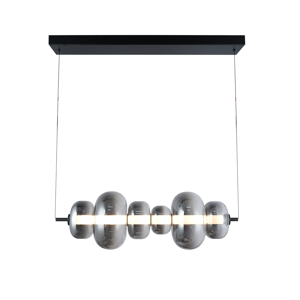 Illuminate your space with the Astra LED island chandelier, a striking embodiment of contemporary elegance and timeless allure. Featuring a radiant white LED inner tube, it is beautifully encased within smoke ombre glass layers, creating a mesmerizing gradient effect. The sleek black frame adds an elegant contrast, making this piece a captivating centerpiece for any interior.
