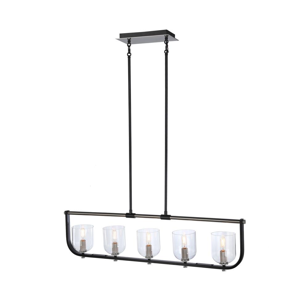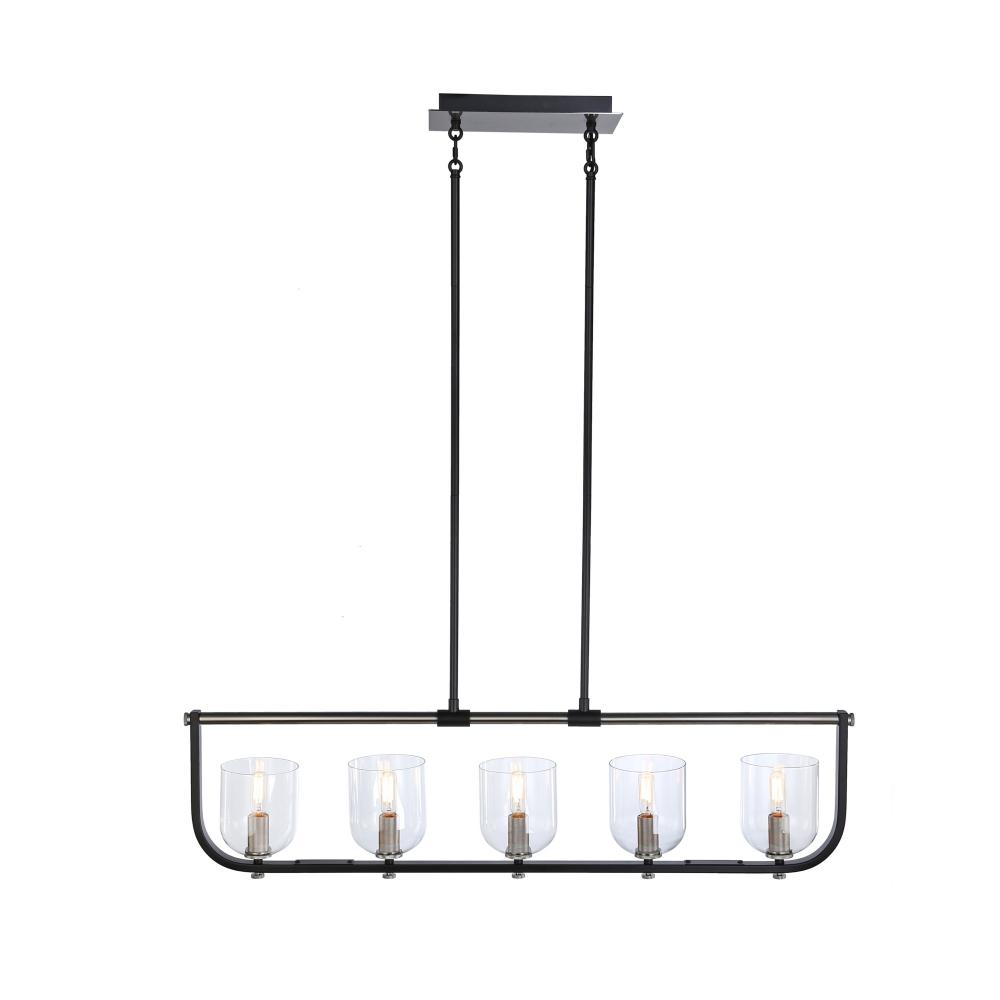 The Cheshire Collection is a spectacular grouping of chandeliers designed by Kevin Kraemer. The frames are black and complemented with nickel. There is fine attention to all the details from the frame shape matching the curves in the glass to the exquisite knural parts on the candle covers and knobs. (Also available in black with brass accents) Island chandelier shown