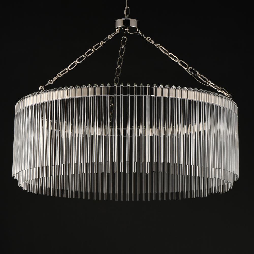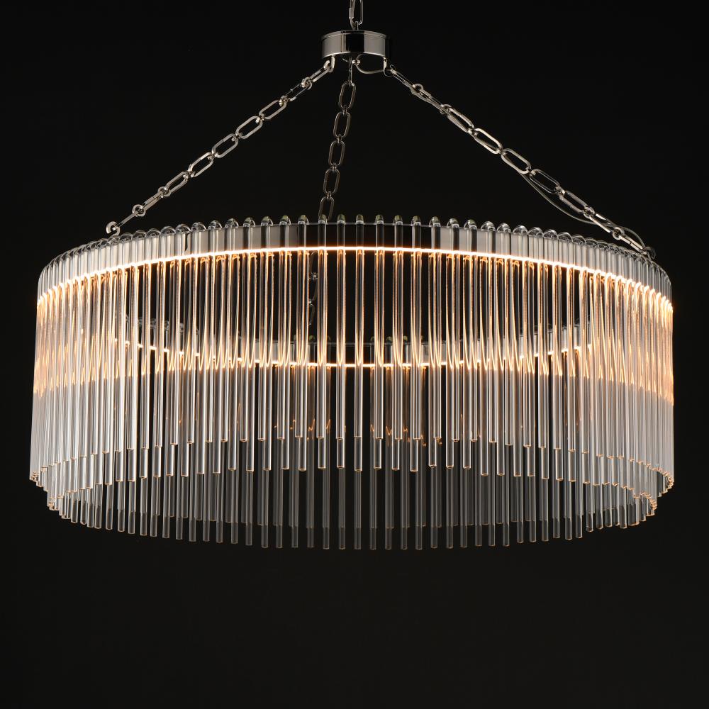 Clear glass rods elegantly curve to drape over a metal frame, encasing an integrated LED light source within. These ornamental glass rods form a luminous curtain, softly illuminated by the LEDs. The LED light source features an adjustable color temperature