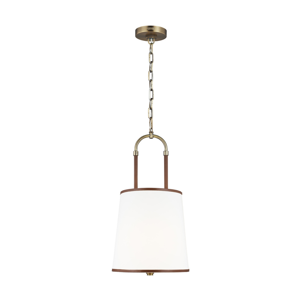 In the Katie one light shade pendant leather straps contrast with metal and white linen fabric shade to round out a timeless design. Available in: Time Worn Brass with Brown Leather or Polished Nickel with Black Leather. The combination of leather and steel gives this round chandelier equestrian flair.
