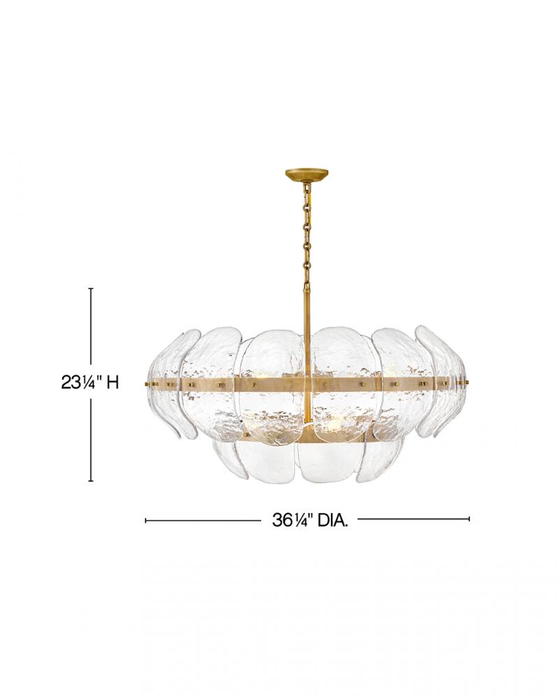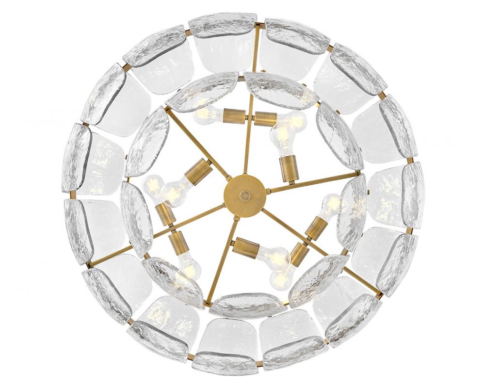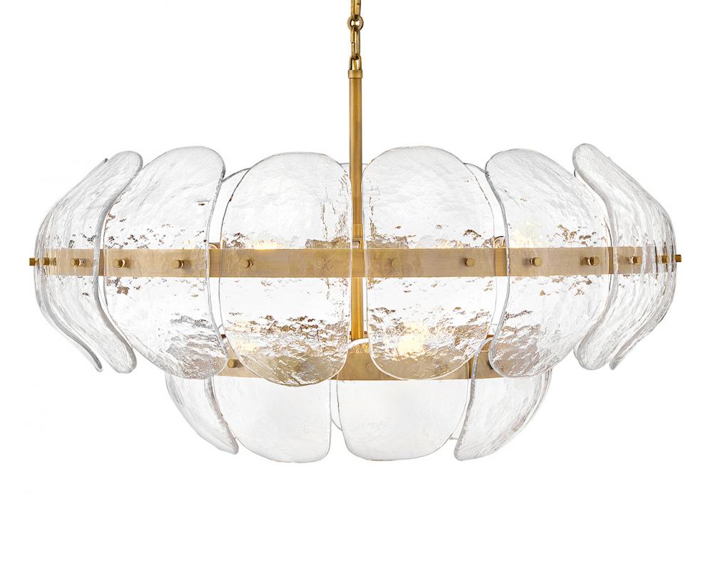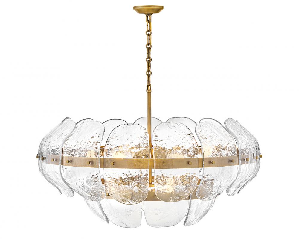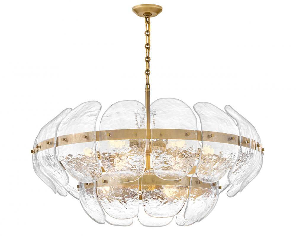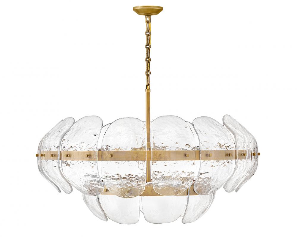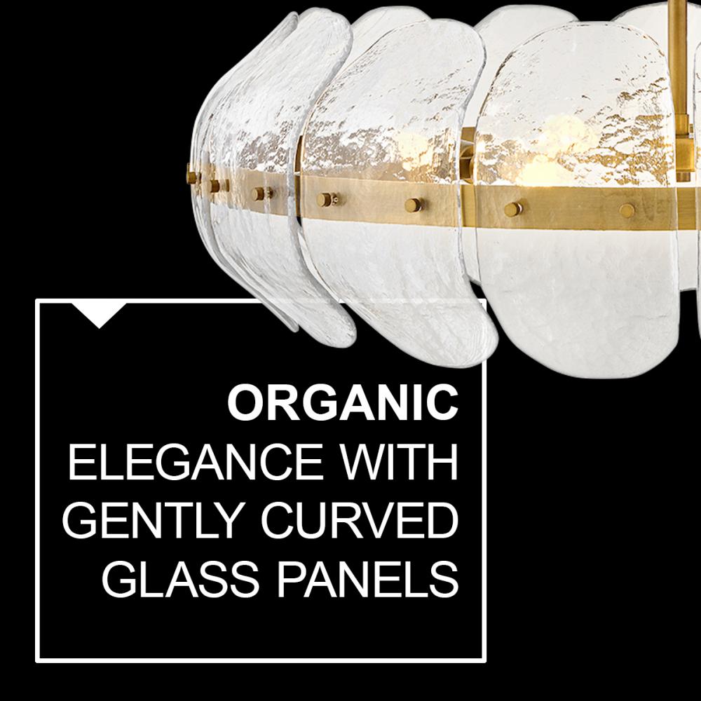 Inspired by the organic elegance of blooming water lilies, Lillia’s large shade is formed from gently curved glass panels. Subtle handcrafted texture creates natural variations in illumination, accentuated by a classic Heritage Brass finish.
