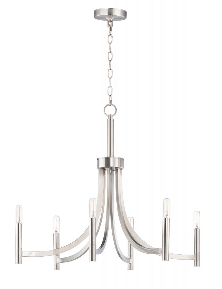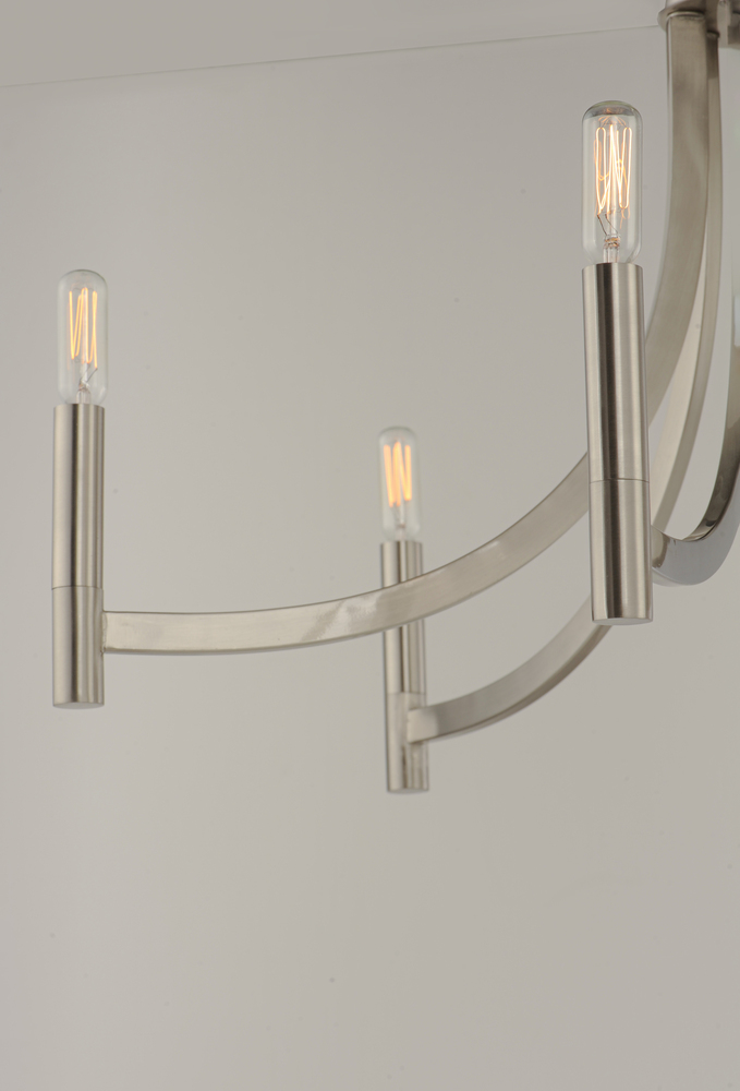 This transitional style chandelier collection features sweeping rectangular arms that transitions to a simple tubular candles. Available in Bronze with Antique Brass accents or all Satin Nickel for a more modern approach.