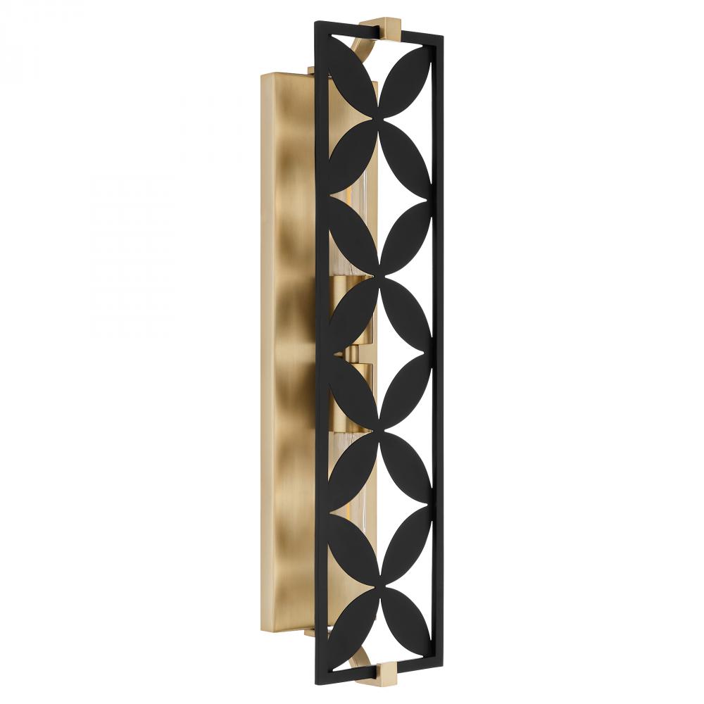 The Mariposa series is embellished with a repeating geometric floral pattern of matte black metal petals. These pieces contrast beautifully with aged brass frames. Exposed lamps enhance the collection's artful aesthetic and allow the light to interact with the decorative pattern, casting intricate shadows and creating a dynamic lighting effect. The overall design of the series, with its blend of shapely patterns and elegant finishes, makes it a perfect focal point for spaces such as dining rooms, living rooms, or entryways. Choose from a selection of ceiling mount, vanity, or pendant designs.