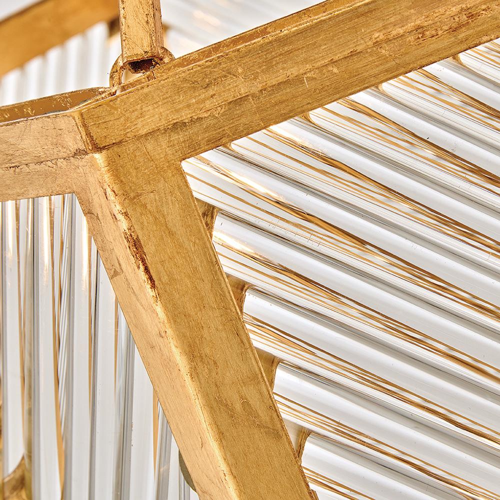 A reimagining of vintage designs from the 40s and 50s, Sura’s transitional, hexagonal Distressed Brass frame creates a glamorous yet understated and tailored appeal. Cylindrical glass rods set at alternating angles echo a soft herringbone pattern, juxtaposing geometry within geometry. Layered details create a reeded effect that is reflective and alluring.