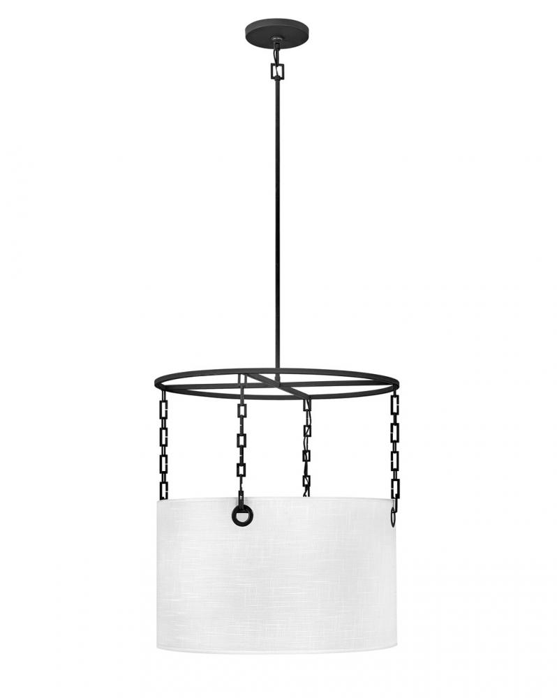 Tribeca’s modern drum pendant design thrills with edgy details. A custom Black chain suspends the crisp white drum shade, held in place by the oversized Black metal grommets and circular gridwork frame.