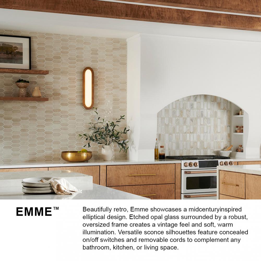 Beautifully retro, Emme showcases a midcentury-inspired elliptical design. Etched opal glass surrounded by a robust, oversized frame creates a vintage feel and soft, warm illumination. Versatile sconce silhouettes feature concealed on/off switches and removable cords to complement any bathroom, kitchen, or living space.