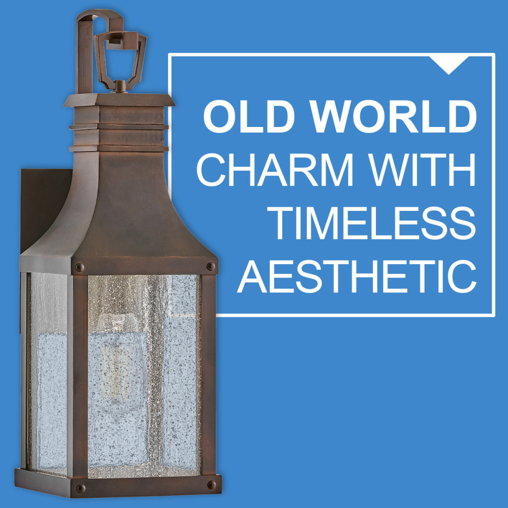 Taking inspiration from an English lantern, Beacon Hill achieves a timeless aesthetic. Part of the Heritage collection, this traditional style features a striking Blackened Copper or Museum Black aluminum frame. The heavily seeded glass pays homage to its Old World charm.