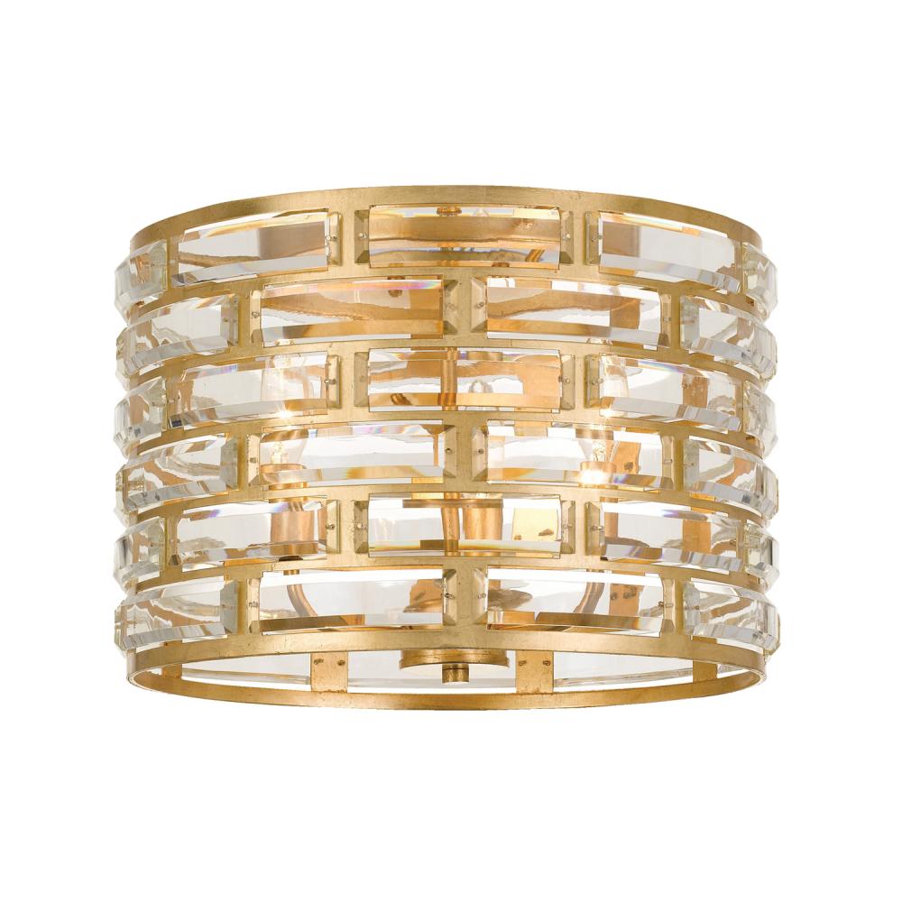 Rich faceted cut crystal meets clean golden lines resulting in vibrant style for any home. Candelabra lights shine through the open drum design of the Meridian. The rhythmic frame features rich curved faceted cut crystal jewels arranged on a contemporary frame. This statement piece is perfect to add grandeur to a dining room, hallway or bedroom.