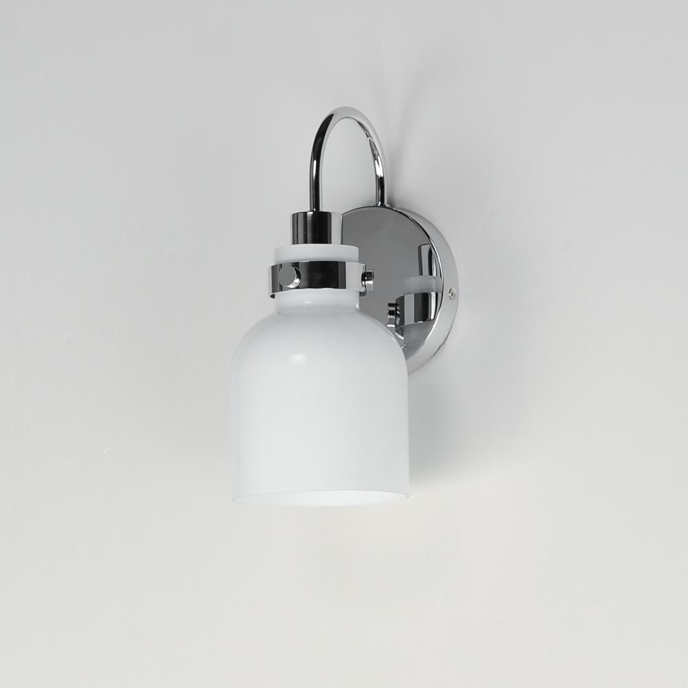 Celebrate nostalgia using these sconces that feature opal White glass shades in a bell shape. Supported on rings of metal in your choice of Polished Chrome or a bolder two-tone Black and Satin Brass, this refreshing take plays into a retro aesthetic of you