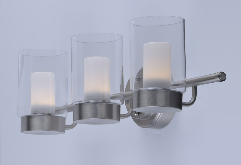 A contemporary design featuring a Satin Nickel frame supporting Clear cylinder glass shades with Frost interior diffusers all powered with energy efficient LED technology. Finally LED technology at an affordable price.