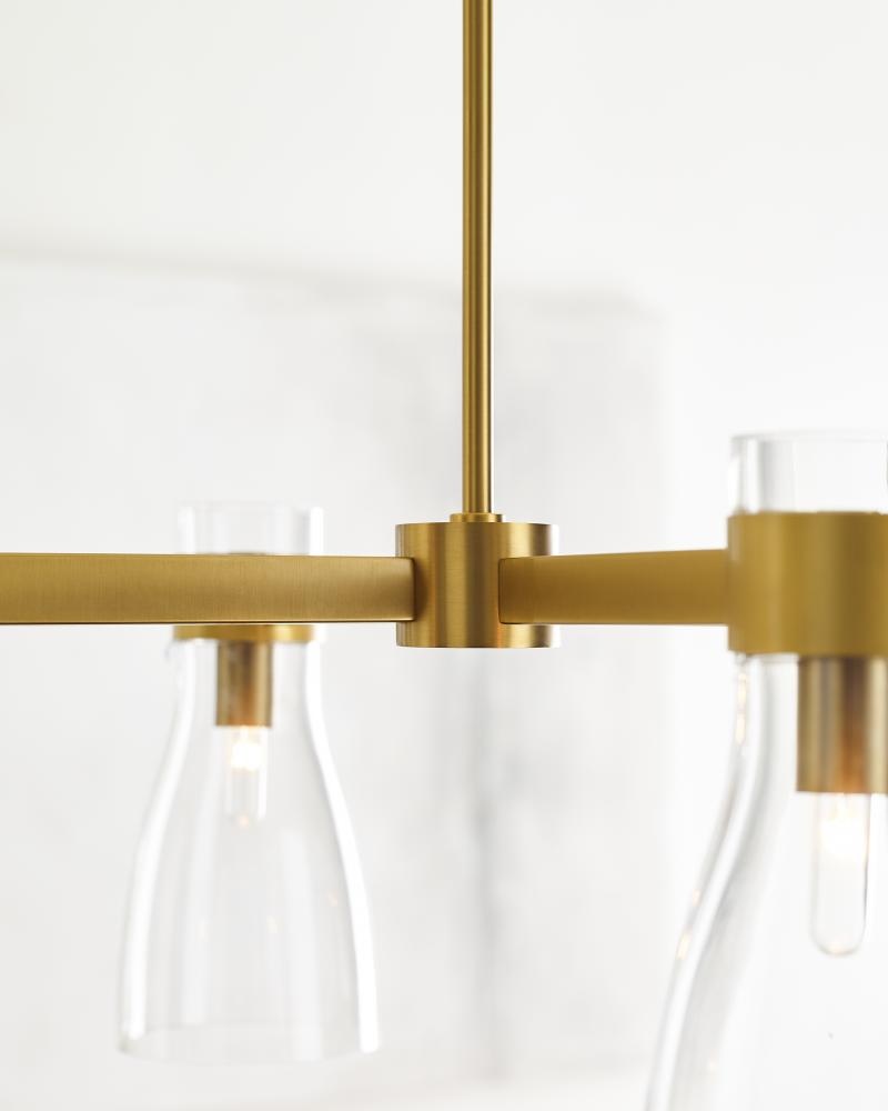 The Moritz four light single tier chandelier in burnished brass is created around a linear frame includes five glass shades originally inspired by the form of classic task lamps, giving it a contemporary twist. A beautiful focal point in living and dining rooms.