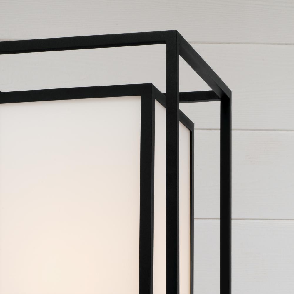 The Black finish accents the rectangular form, while the Soft White Glass creates a welcoming glow.