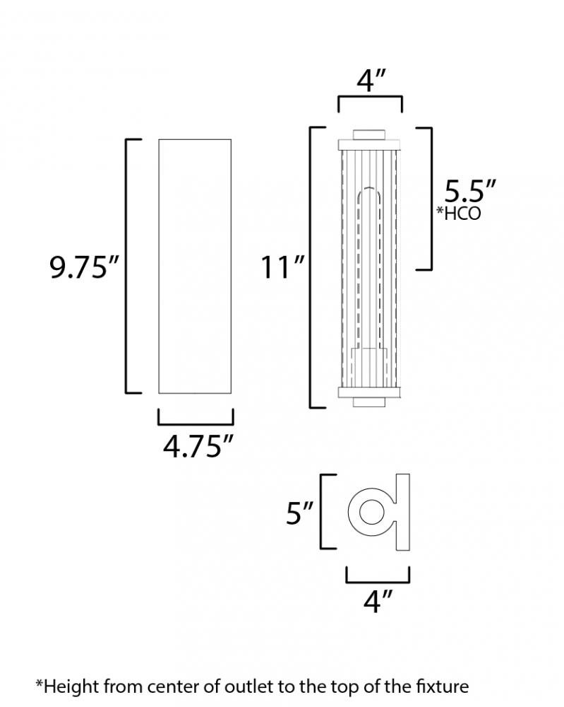 Internally ribbed clear glass tubes refract tubular lamps, creating a shimmering light effect. The glass is supported by a two-tone black frame with Aged Brass accents, making this sconce suitable for both indoor and outdoor installations. With a depth of