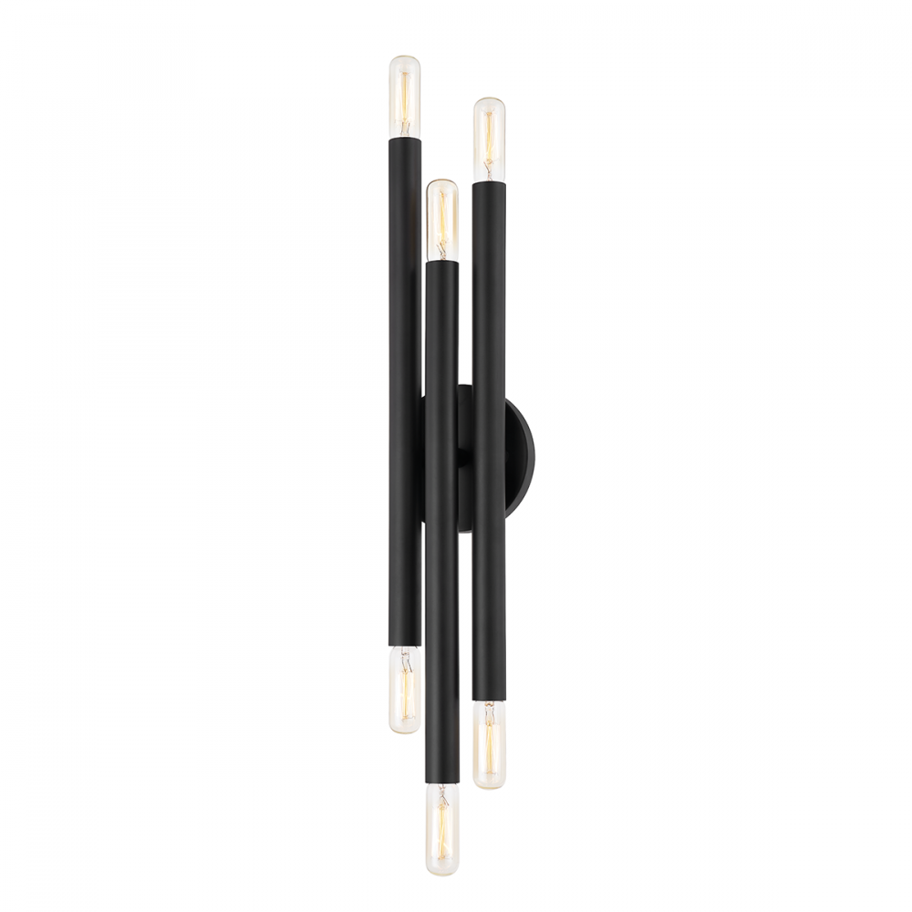 Streamlined, cylindrical metal shades are mounted at varying heights and depths from a circular backplate for a sleek and minimalist take on a mid-century modern silhouette. The variety of finishes (Patina Brass, Bronze and Polished Nickel) complement any interior, with the Polished Nickel working particularly well in a powder room or bath. This versatile six-light wall sconce can be styled horizontally or vertically.