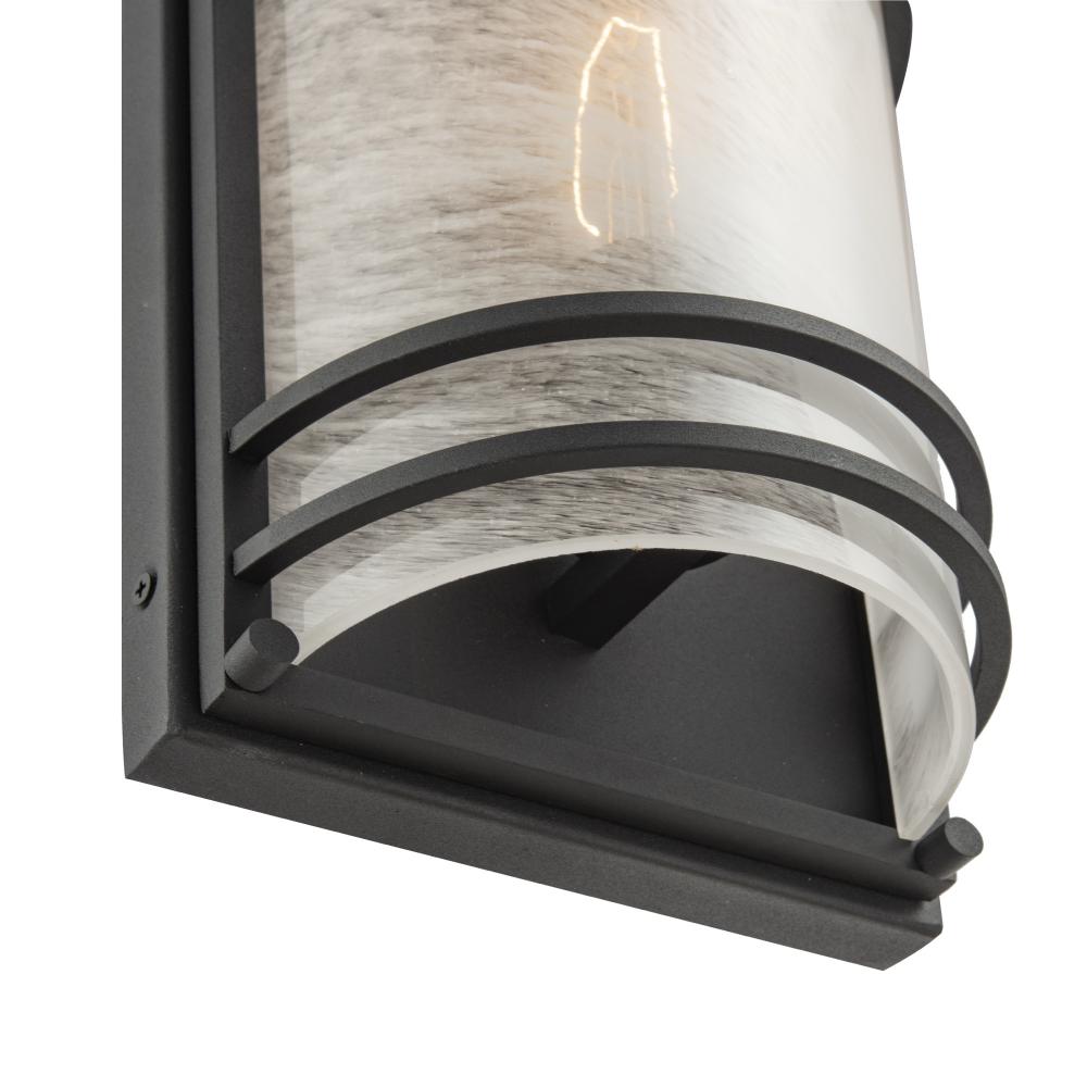 This outdoor wall sconce, part of the Keswick collection, radiates understated sophistication with its sleek black frame and gracefully arched silhouette. The “white swirl glassware” creates a mesmerizing, cloud-like texture, softly diffusing the light to cast a warm and inviting glow. Perfect for enhancing your outdoor spaces, it blends contemporary design with a touch of artistic sophistication.