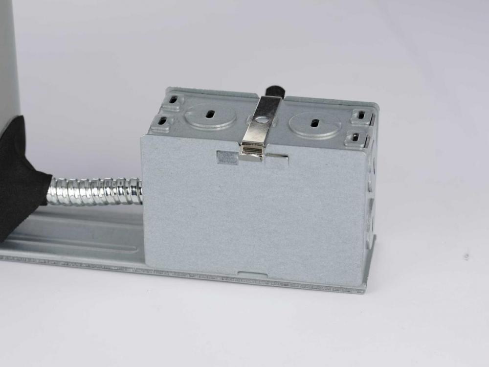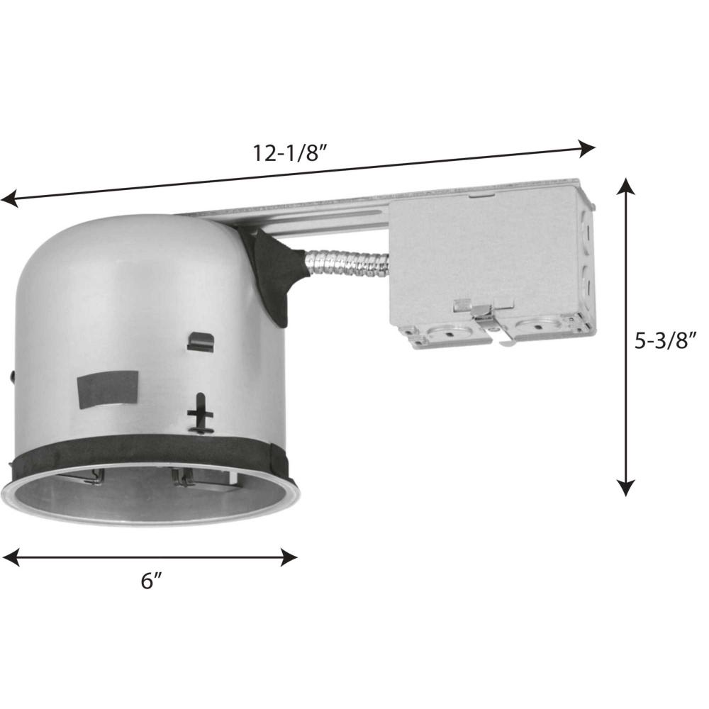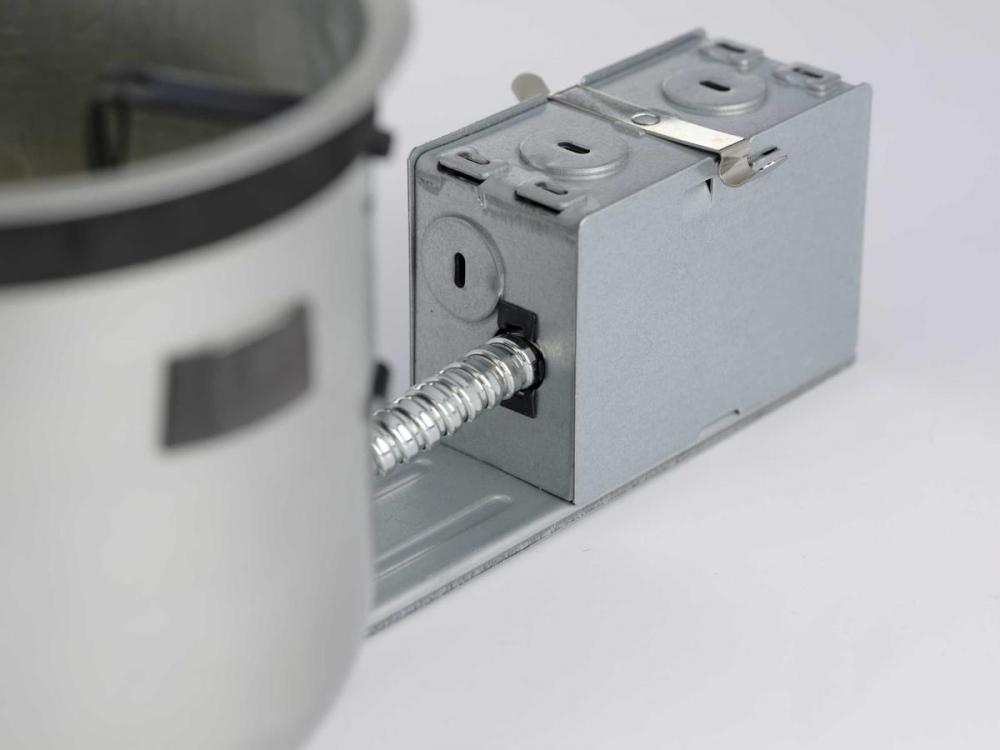 Universal J-box with snap-out sides;Removable housing for field inspection of wiring;Ceiling opening measures 5-5/8 in;Recessed depth measures 5-1/2 in;Pryouts ½ in and ¾ in