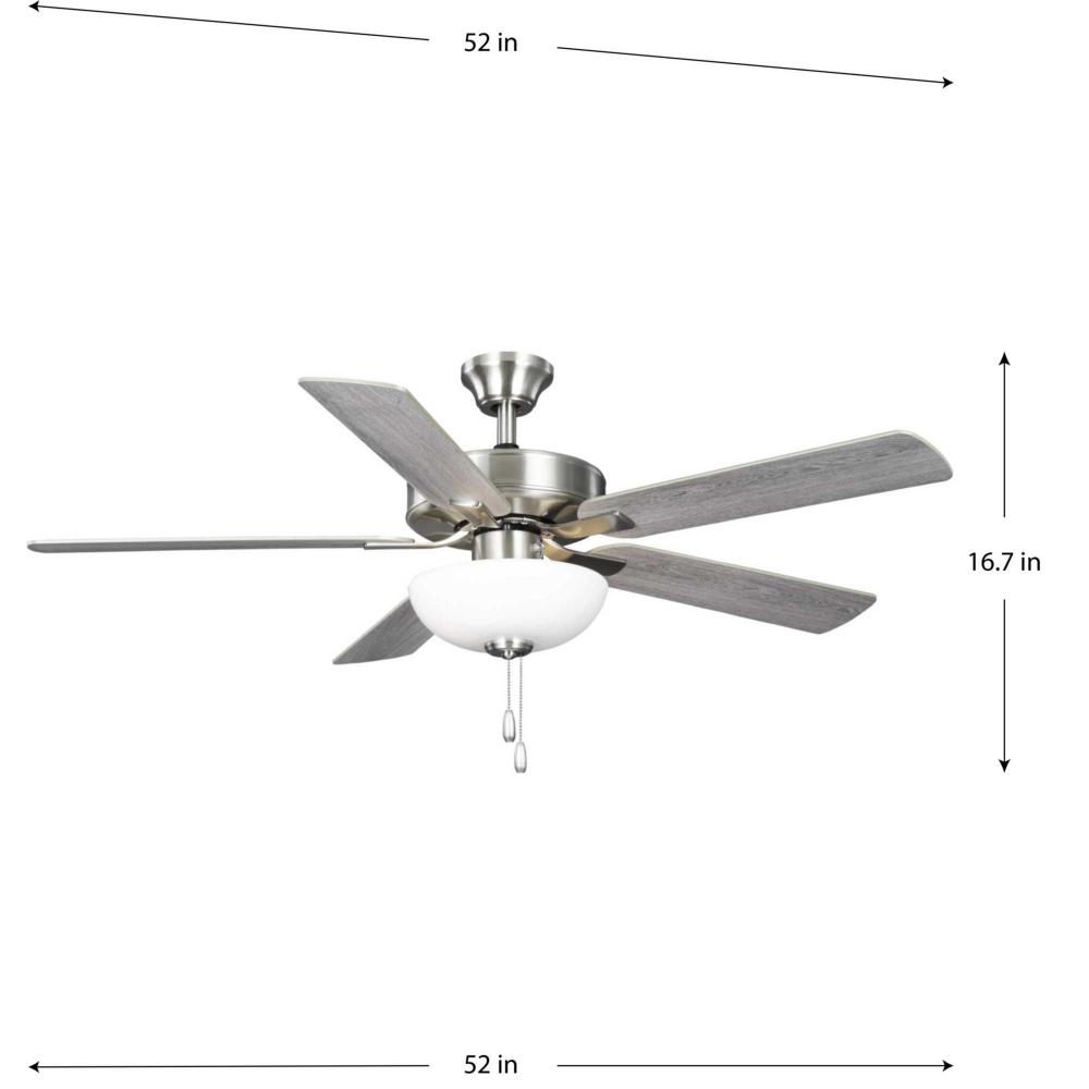 The AirPro 52” 5-blade ceiling fan refreshes interiors with a sleek, modern form coated in smooth Brushed Nickel finish. Five clean-lined fan blades extend outward from a streamlined motor housing that contains a powerful AC motor. Its versatile yet timeless design makes it ideal for a wide range of interior décor styles. The fan has an AC motor and is rated for maximum efficiency. A Unipack option packages the light kit so that it ships with the fan, eliminating both the need to order the light kit separately and having the light kit shipped separately from the fan. A shatterproof white Frosted polypropylene dome shade offers durability and optimal, even illumination. Two medium based LED lamps (8.5-Watt, 80CRI, 3000K) are included. An accessory wall and remote control can be added (sold separately). The fan can be installed on a flat or sloped ceiling. The blade arms have Captive Screws allowing for easier installation.