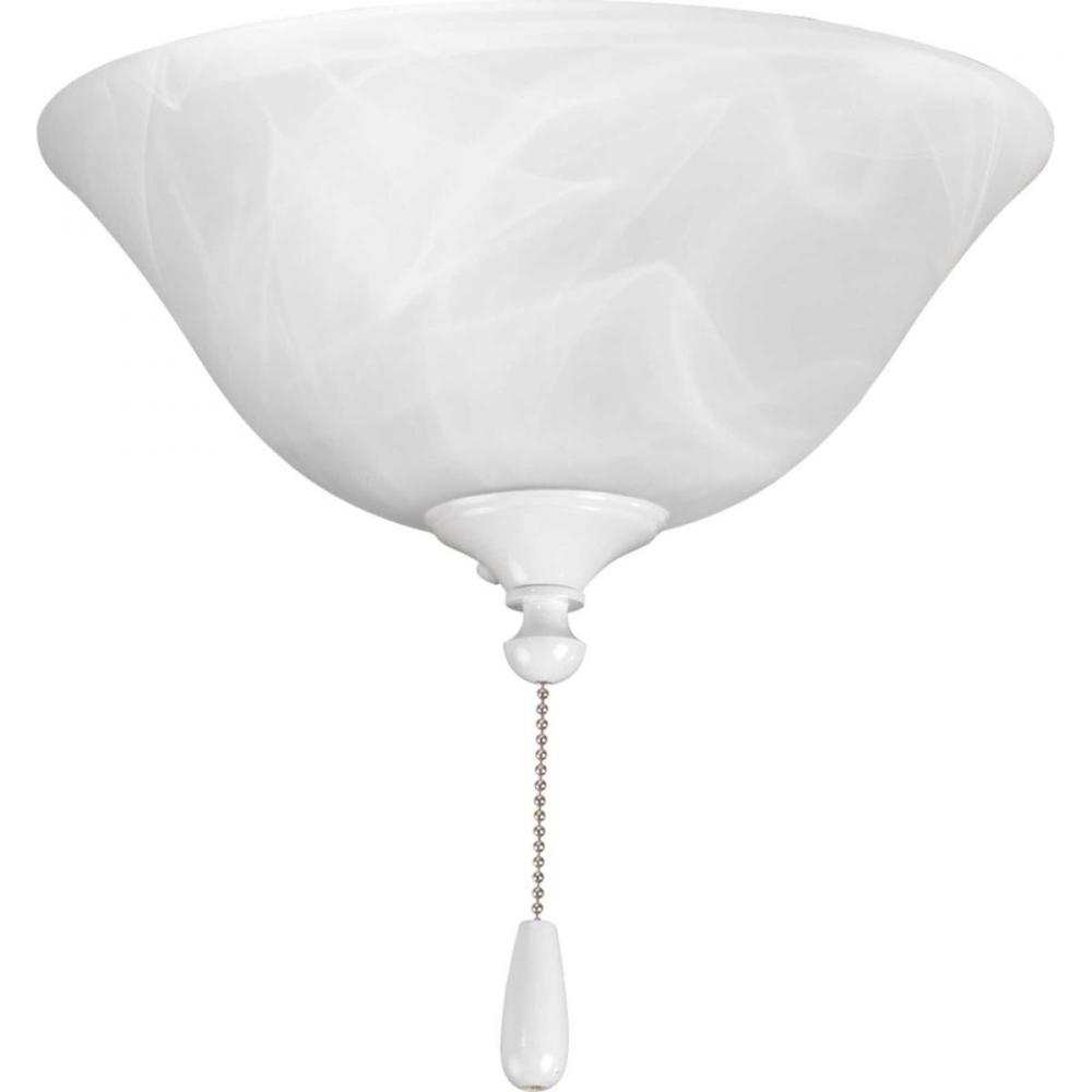 Alabaster style glass bowl ceiling fan light kit casts an inviting illumination in any size room. Includes (-09) Brushed Nickel, (-15) Polished Chrome, (-20) Antique Bronze, (-30) white, and (-143) Graphite finials for use with matching Progress Lighting fans. Universal style lets you use with any indoor fan that accept an accessory light. Quick-connect wiring makes the installation process quick and easy. Includes two 3000K, 800 lumen each (source), Title 24 certified LED bulbs.