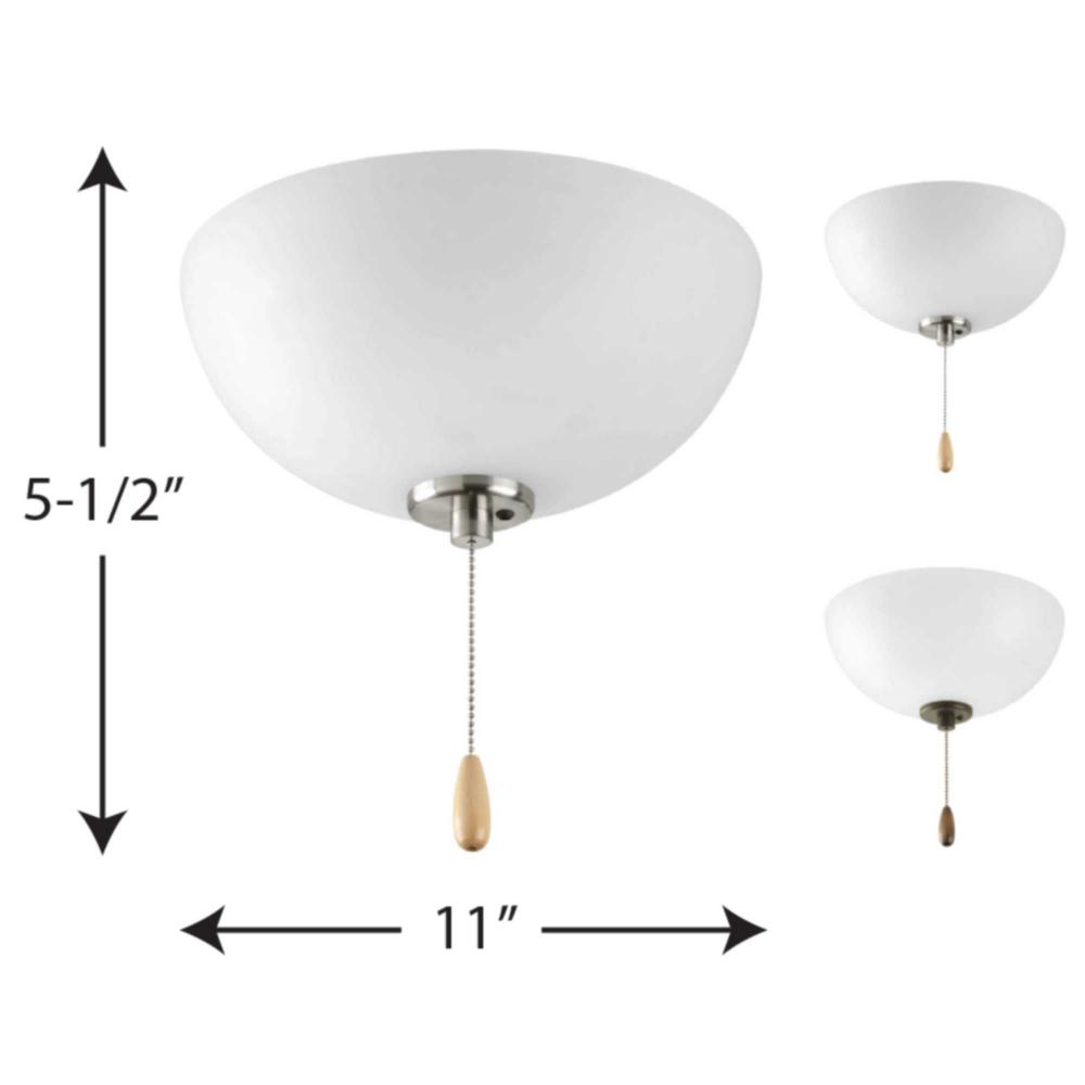 Smooth white etched glass;Pull chain and fob included;Finials included are -09 Brushed Nickel and -20 Antique Bronze.;Quick-connect wiring to any progress fan that accept an accessory light.;Universal Style light kit for use with many fans;Includes two 300