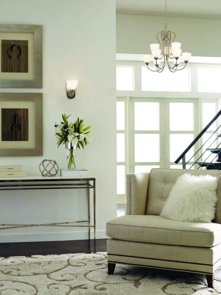 The Heart Collection possesses a smart simplicity to complement today's home. This one-light bath bracket includes etched glass shades to add distinction and provide pleasing illumination to any room. Versatile design permits installation of fixture facing either upwards or downwards. Plated Brushed Nickel scroll arms create an airy effect.