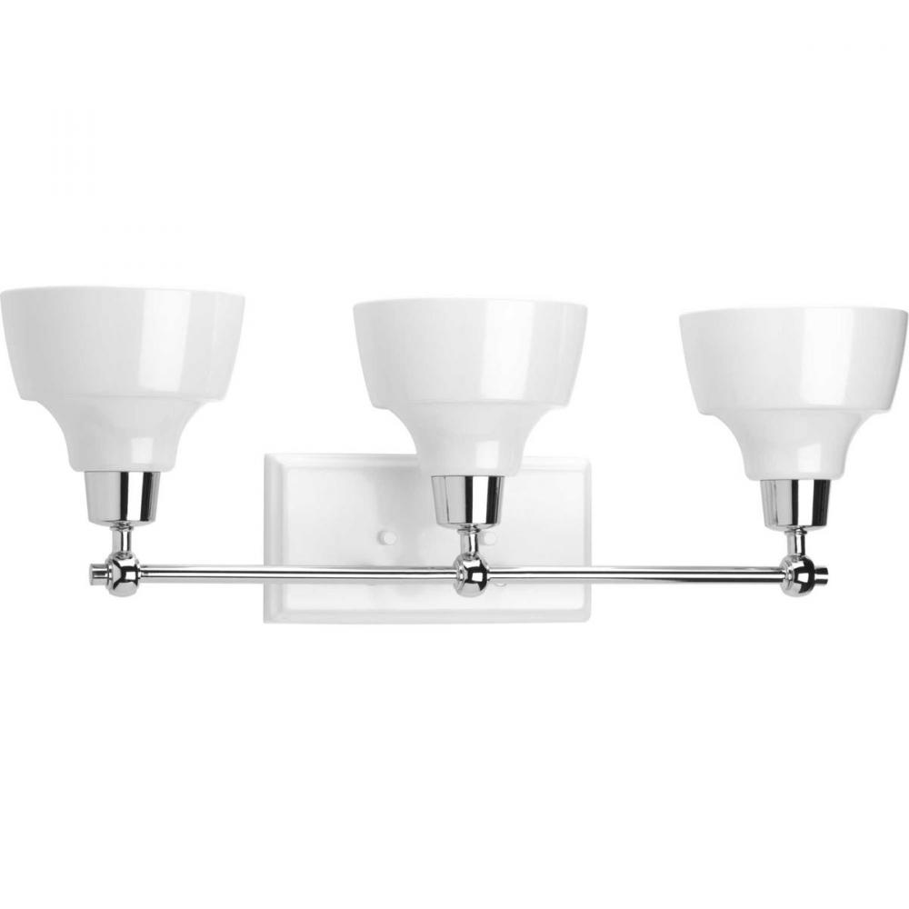Ideal for a bathroom;Perfect for coastal, farmhouse, and urban industrial style settings;Gloss white with crisp polished chrome accents;Crisp white metal shades;Mount the light fixture facing up or down;Use 3 medium base bulbs that are sold separately (100