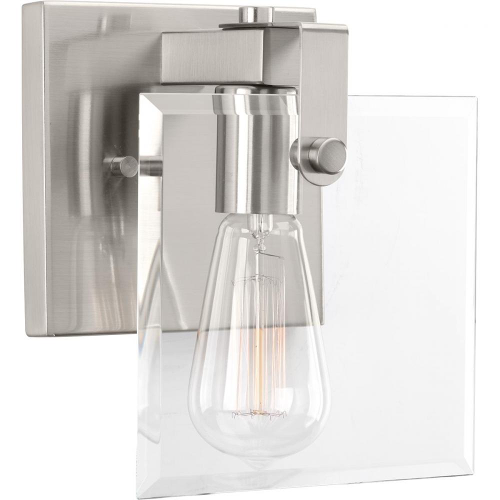 Ideal for a bathroom, dining room, hallway, or foyer;Perfect for luxe, modern, and urban industrial style settings;Beautiful brushed nickel finish;Crisp clear beveled glass shade;Mount the light fixture facing up or down;Use 1 medium base bulb that is sold