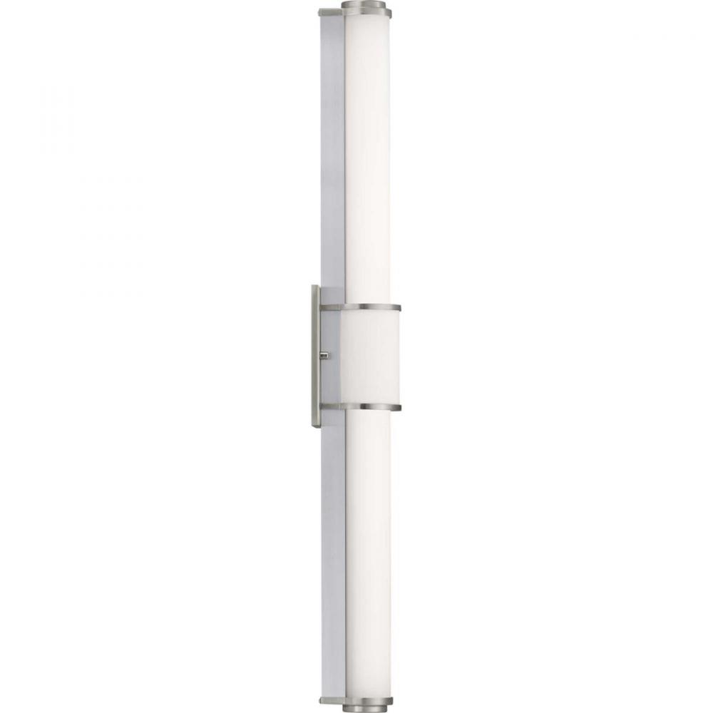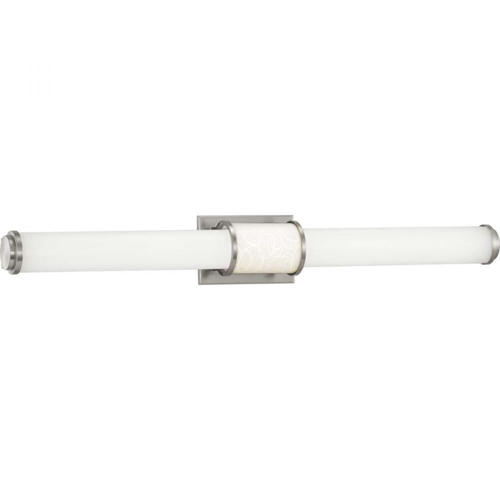Ideal for a bathroom;Perfect for modern style settings;Beautiful brushed nickel finish;Crisp white acrylic shade;Fixture can mount horizontal and vertical;Includes 1 integrated LED (33 W), 2475 lumens, 3000 K, 90 CRI, dimmable;Measures 36-inch width by 4.